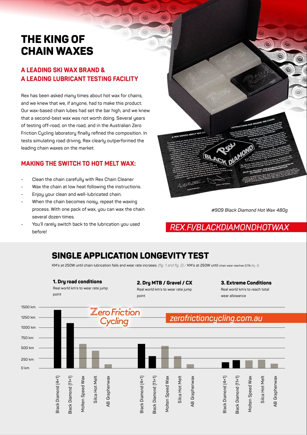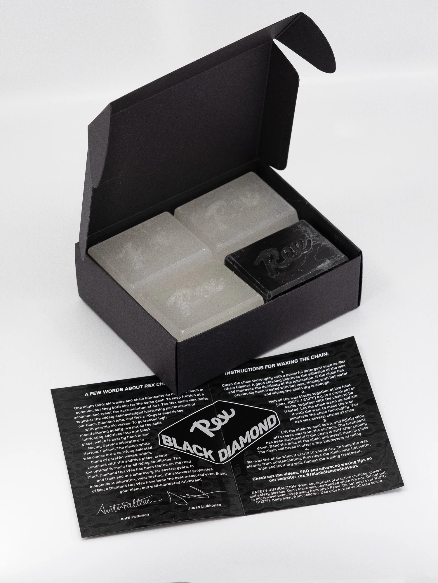 With the synthetic, wax-based Black Diamond chain lubricant, the Finns from Rex have already broken all records in the chain durability test. But resting on their laurels was not an option for the wax specialists from ski racing. Even if you might think that ski waxes and chain oils have little in common, they both pursue the same goal: keep frictional resistance as low as possible and prevent dirt and other contaminants from adhering. With the new Black Diamond Hot Wax, Rex combines 70 years of experience with paraffin ski waxes with the outstanding additives of the liquid Black Diamond chain lubricant.