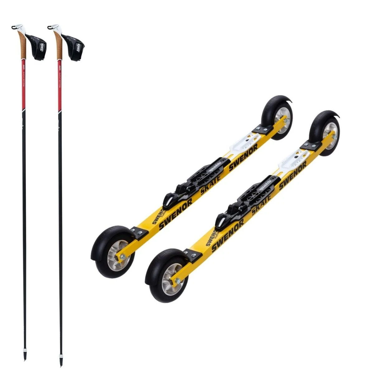 Swenor Aluminium Skate rollerskis and premounted Rottefella Rollerski Skate bindings. Also includings Swix Roadline 2 rollerski poles.